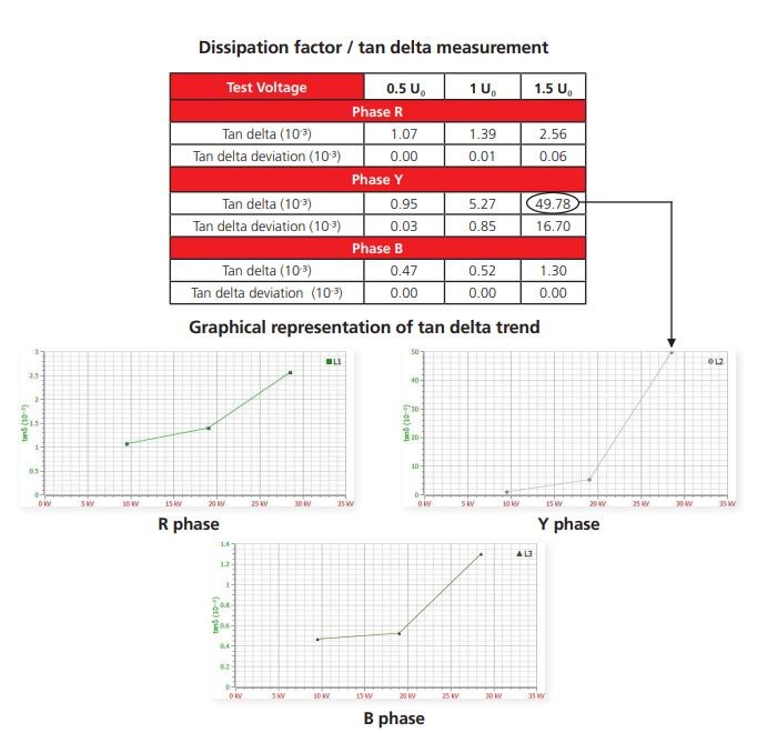 The above graphs show the TD trend for each individual phase. It can be observed that the Y phase has far higher values compared to the R and B phases, as the dielectric losses in the Y phase at 1.5 U₀ are 20 to 40 times higher. The results were compared with the evaluation criteria set out by the IEEE 400.2-2013. The recommendations suggested “No action required” for the R and B phases, but “Action required” for the Y phase.
