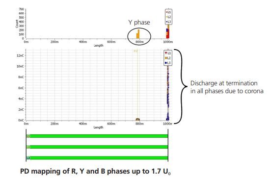 With increasing voltage over 1 U₀, PD’s were localised at the terminations. After analysing the PRPD pattern, this turned out to be corona discharges. Additionally, in the Y phase (which had high TD values) another PD location became visible and discharges were located at about 800 m away from the near end.