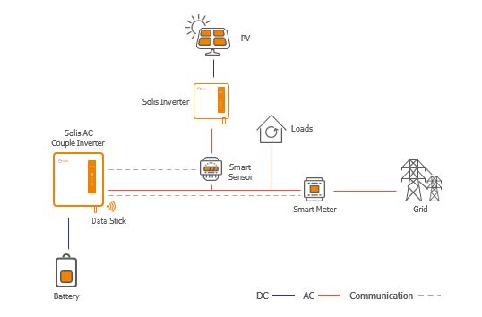 In this setup, the Solis AC-coupled inverter charges/discharges the battery based on smart meter data. A smart sensor also collects generation data from the existing PV inverter and displays it on the Solis monitoring system.