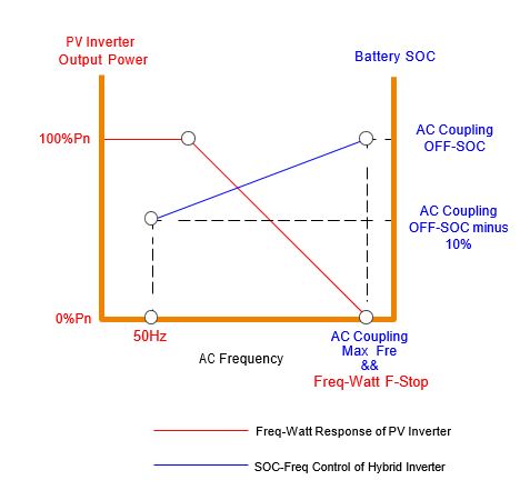 When battery SOC falls 10% below the OFF-SOC setting, the hybrid inverter ramps frequency upward. This prompts the PV inverter to derate output until SOC reaches the OFF-SOC point, at which the frequency