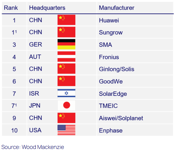 While Wood Mackenzie did not disclose individual ranking positions or scores beyond the top performers, the chart reflects a broad group of manufacturers competing in the global solar inverter market, highlighting increasing diversity beyond the top two suppliers.